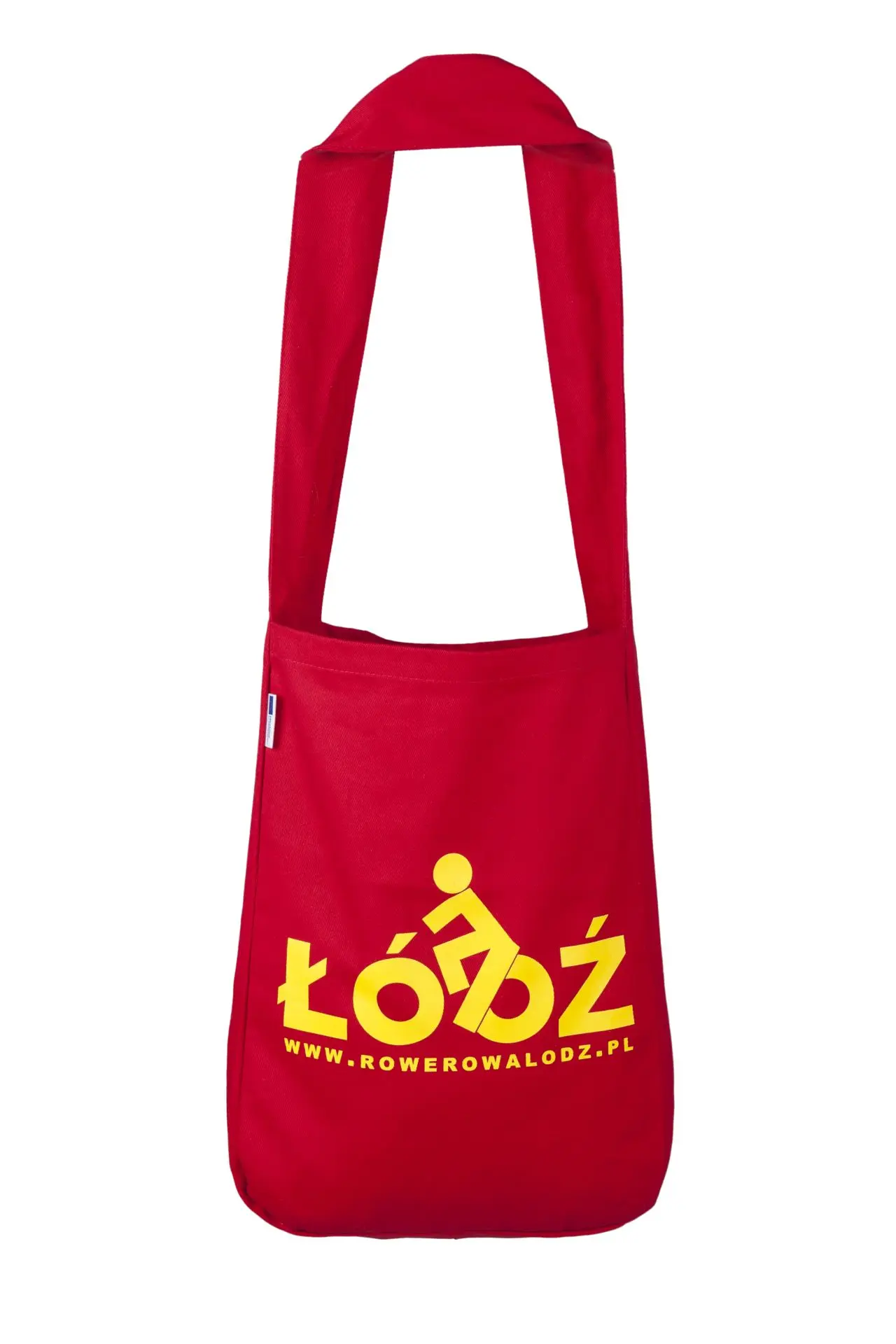 Wygodna torba na ramię z jednym uchem, torba czerwona z drelichowej tkaniny, metka wszyta w bok torby, torba z nadrukiem sitodrukiem.