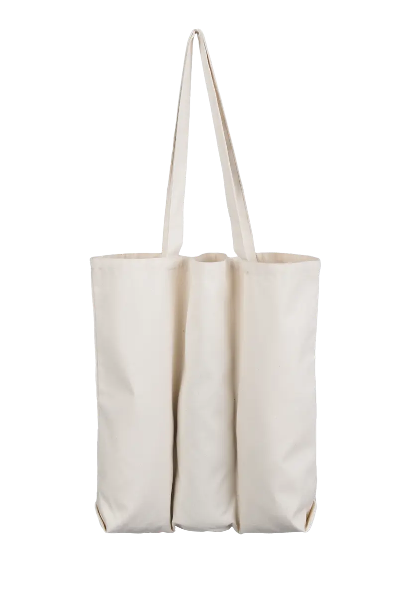 Praktyczna torba do przenoszenia butelek w bezpiecznym położeniu – model B. Prezentowany model posiada wysokość 42 i szerokość 48 centymetrów. Szerokość dna torby wynosi 8 centymetrów. Dzięki zastosowaniu pionowych przeszyć torba została podzielona na trzy części – dwie zewnętrzne o szerokości 17 centymetrów, wewnętrzna zaś posiada szerokość 14 centymetrów. Tak jak torba na butelki model A, prezentowany model posiada uszy o szerokości 2,5 i długości 68 centymetrów, co zapewnia odpowiedni komfort przenoszenia zarówno w dłoni, jak i na ramieniu. Co istotne – uszy połączone są z torbą w bliskiej okolicy przeszyć, dzięki czemu przenoszenie nawet wysokich butelek nie powinno w żaden sposób ograniczyć swobodnego dostępu do uszu i wygodnego przenoszenia.