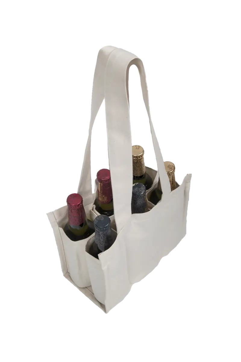 Przenoszenie sześciu butelek z napojami w foliowej torbie zawsze wiąże się z ryzykiem pęknięcia torby i straty butelek. Warto więc pozbyć się tego zagrożenia, zamiast foliowych i nieprzyjaznych środowisku toreb, wykorzystać do przenoszenia solidnych toreb bawełnianych. Prezentowana torba na butelki model C pozwala na bezpieczne i komfortowe przeniesienie do sześciu butelek lub innych pojemników z napojami. Dzięki zastosowaniu wysokiej jakości materiałów można mieć pewność, iż torba doskonale poradzi sobie z obciążeniem.