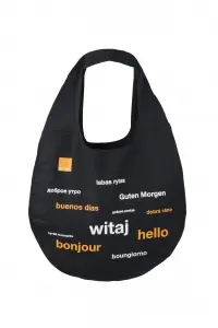 Torba poliestrowa, płaska, z jedną rączką na ramię, nadruk farbami rozpuszczalnikowymi, metka z tej samej tkaniny co torba, wszyta w bok.